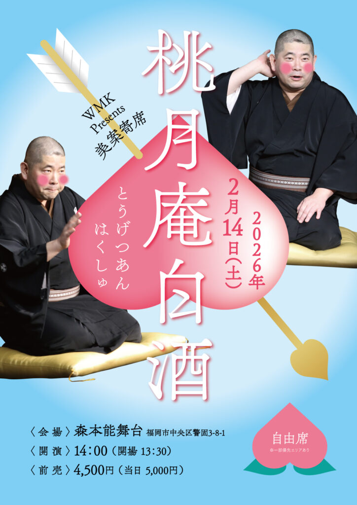 美案寄席 美案寄席 [2026/2/14(土)] 桃月庵白酒 美案寄席 2026/2/14(土)演 者 :桃月庵白酒会 場 :森本能舞台 (福岡市中央区警固3-8-1)開 場 :13:30開 演 :14:00座 席 :自由席前 売 :4,500円(当日 5,000円) チケットはこちら ※未就学児のご入場はご遠慮願います。 LINE note 美案寄席