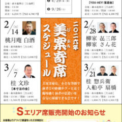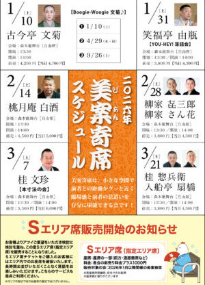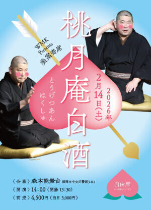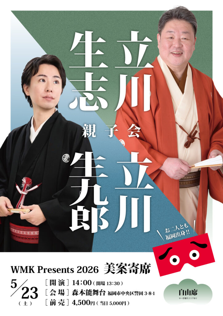 美案寄席 美案寄席 [2026/5/23(土)] 立川生志 立川生九郎 親子会 美案寄席 2026/5/23(土)演 者 :立川生志 立川生九郎会 場 :森本能舞台 (福岡市中央区警固3-8-1)開 場 :13:30開 演 :14:00座 席 :自由席前 売 :4,500円(当日 5,000円) チケットはこちら ※未就学児のご入場はご遠慮願います。 LINE note 美案寄席