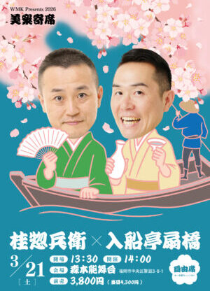 美案寄席 美案寄席 [2026/3/7(土)] 桂文珍 美案寄席 2026/3/7(土) 【本寸法の会】演 者 :桂文珍会 場 :森本能舞台 (福岡市中央区警固3-8-1)開 場 :13:30開 演 :14:00座 席 :自由席前 売 :5,500円(当日 6,000円) チケットはこちら ※未就学児のご入場はご遠慮願います。 LINE note 美案寄席