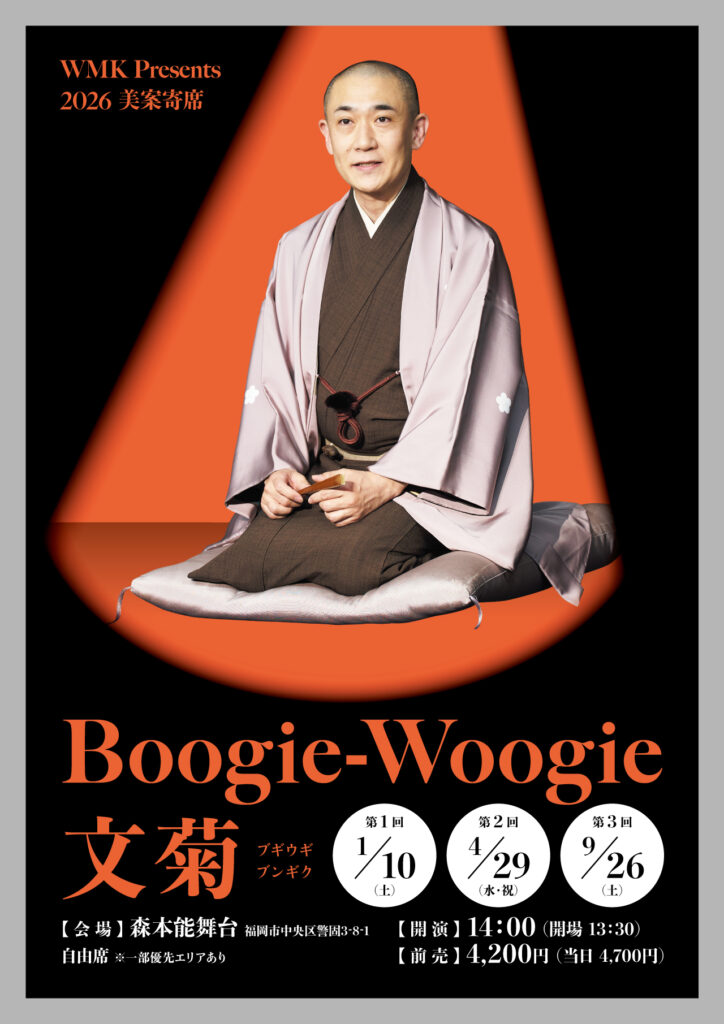 美案寄席 美案寄席 [2026/4/26(水・祝)] 古今亭文菊 美案寄席 2026/4/29(水·祝) 【Boogie-Woogie文菊♪】 演 者 :古今亭文菊会 場 :森本能舞台 (福岡市中央区警固3-8-1)開 場 :13:30開 演 :14:00座 席 :自由席前 売 :4,200円(当日 4,700円) チケットはこちら ※未就学児のご入場はご遠慮願います。 LINE note 美案寄席